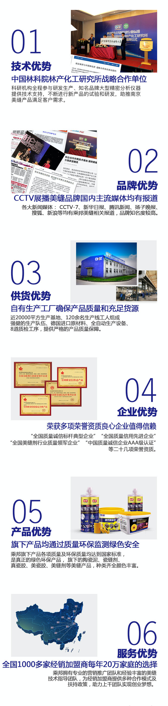 南京乘邦環??萍加邢薰境闪⒂?005年,是集南京瓷磚美縫、南京美縫施工、美縫劑產品的研發與銷&售等產業的南京瓷磚美縫公司。目前公司主打美縫產品為國內推出的傳統美縫劑升級產品:乘邦納米陶瓷泥、水性環氧彩砂,天然砂質顏料,化妝品般安全無污染。乘邦陶瓷泥顏色豐富,大大提升裝飾效果,打造魔幻家居,讓家也可以炫酷起來。它綠色環保防霉防污,堅硬如瓷細膩光潔,不僅做到瓷磚縫隙“不變黑”,而且在為每一個家庭健康美麗而努力,這是乘邦公司的最高準則,也是乘邦人為之努力奮斗的目標,以此目標乘邦本著"誠信、合作、專業、超越"的理念,詮釋優質服務,演繹品質生活。同時公司擁有一支管理完善、經驗豐富的專業美縫施工隊伍。在南京瓷磚美縫價格方面也有很大的優勢,每年為南京近萬家庭提供美縫服務,其自主研發的乘邦牌產品在10余省市已有近千個代理商,在全國范圍內享有很高的知名度。